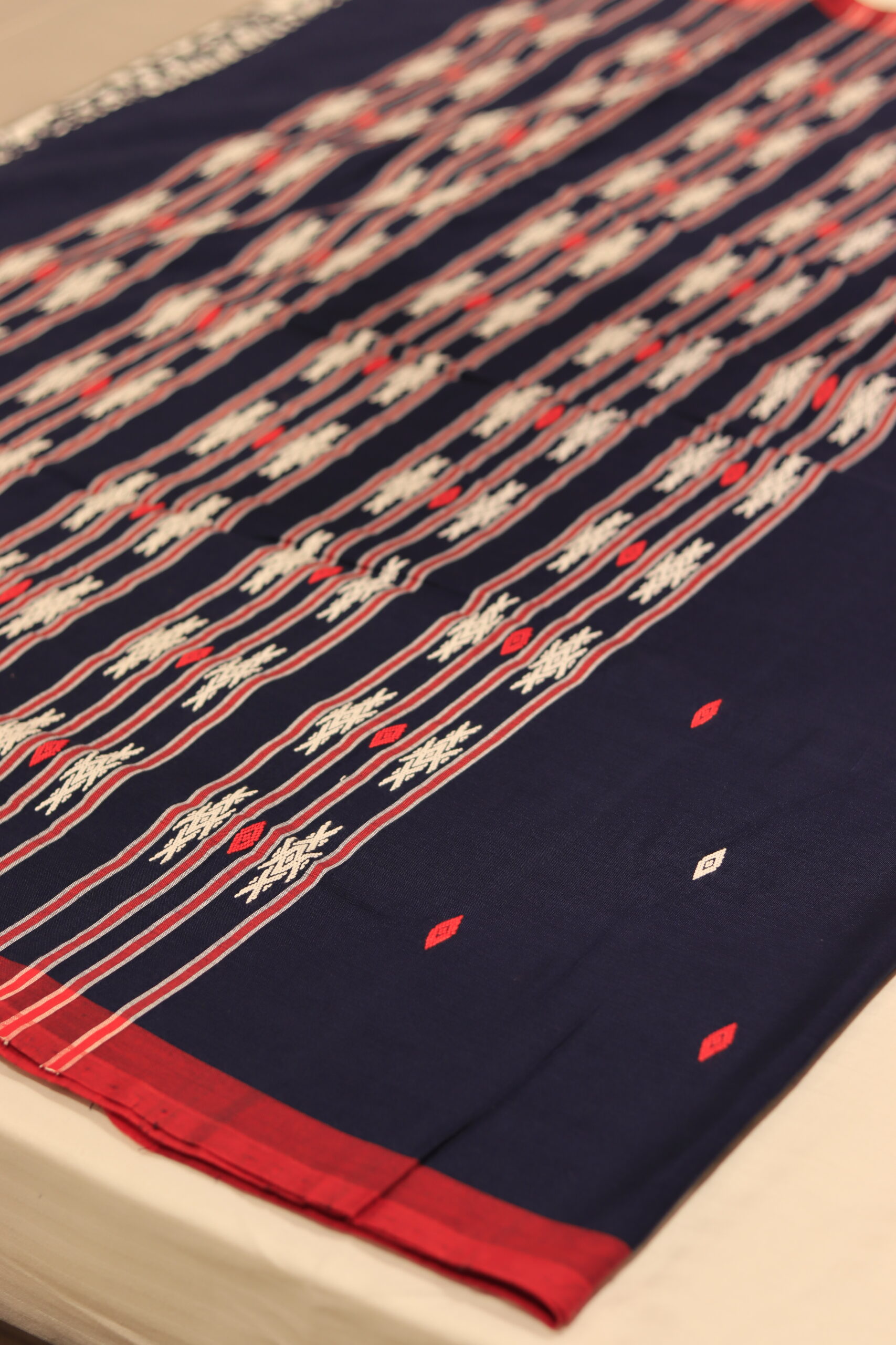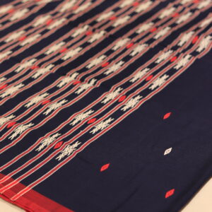 The saree features a sophisticated blend of classic navy blue and rich red, creating a captivating contrast that is both bold and traditional. What truly sets the Amber Saree apart is its exquisite Khamti motif meticulously woven onto the pallu. These intricate patterns draw direct inspiration from the indigenous artistry of the Khamti tribe of Namsai, Arunachal Pradesh, adding a touch of unique heritage and storytelling to your ensemble.